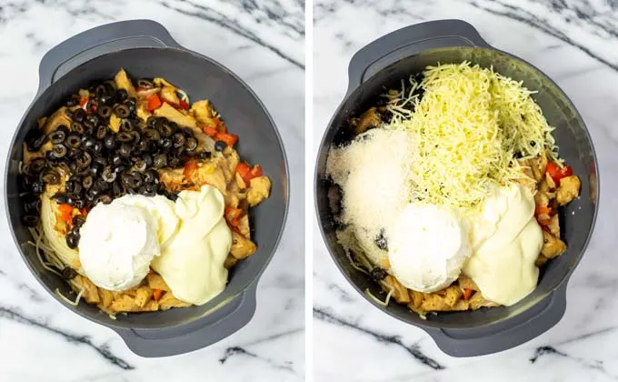 - Next in a bowl combine spaghetti with olives, chicken mix, half of the vegan mozzarella and parmesan, and a good pinch of salt and pepper.