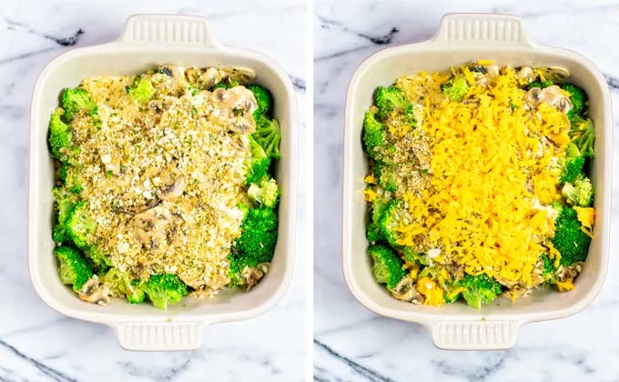 - Start with transferring the steamed broccoli florets to your 10x10 inch casserole dish. Give the sauce on top, followed by the mushroom mix, breadcrumbs and finally top with vegan cheddar. Bake for around 20 minutes, serve immediately on plates or in bowls.