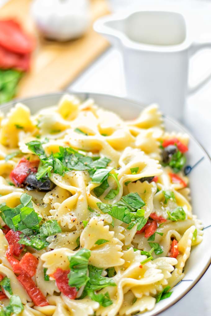 - In a bowl combine the pasta with other optional add ons, like white beans, roasted red peppers, onions, and olives. Mix with the lemon herb dressing.