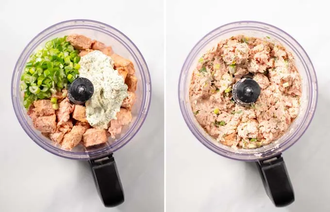 Take the bowl of a food processor and add 3 Tbs from the sauce, salmon, green onions. Chop everything until mix. Make sure to leave some texture.